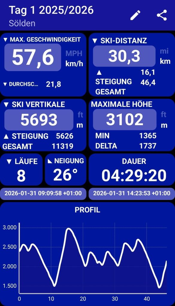 Seit gestern hat der Gaislachkogel auch für Skifahrer ab der Spitze auf. Zuvor war er 2 Wochen gesperrt wegen zu wenig Schnee und zuviel Steinen auf der Piste. Die Pisten sind toll, keine Steine und kein Wind, das habe ich hier noch nie erlebt! Toll!